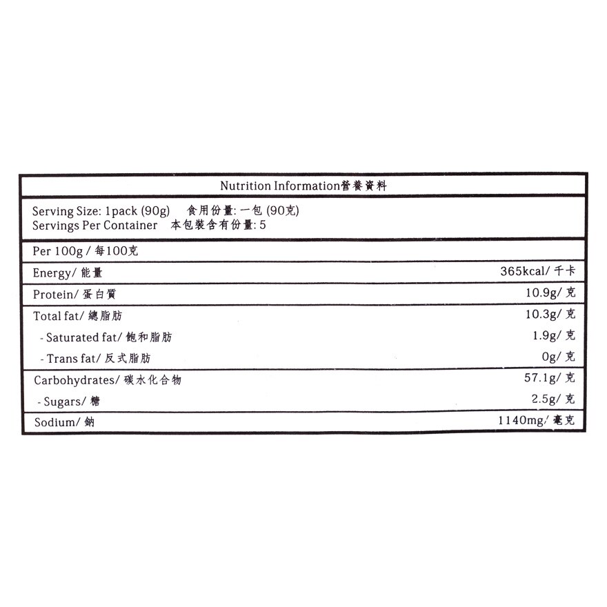麵條: 麵粉, 水, 鹽, 碳酸鈉(酸度調節劑500(i))
